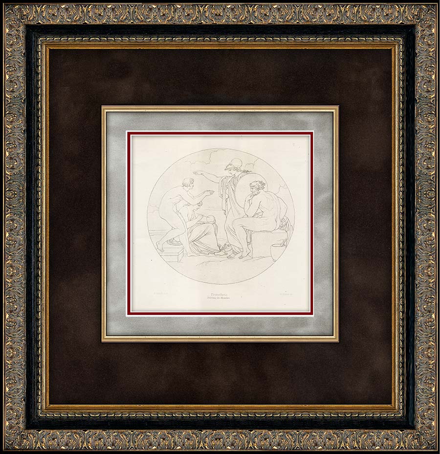 Перед вами подлинная гравюра «Prometheus. Belebung des Menschen» («Прометей. Оживление человека»), созданная Б. Дженелли (1798–1868) в 1863 году. Это редкое произведение отражает начало великого мифа о Прометее и человечестве.